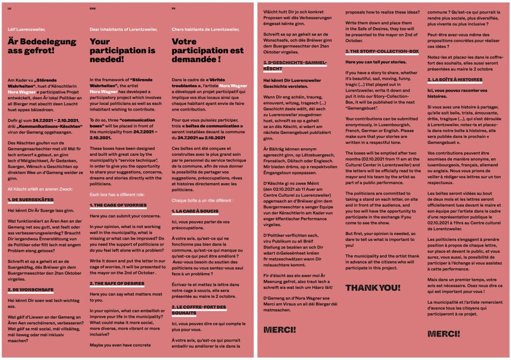 The inhabitants of the town were invited by post to write down their complaints, suggestions and wishes, and to put them in theses three letter boxes.